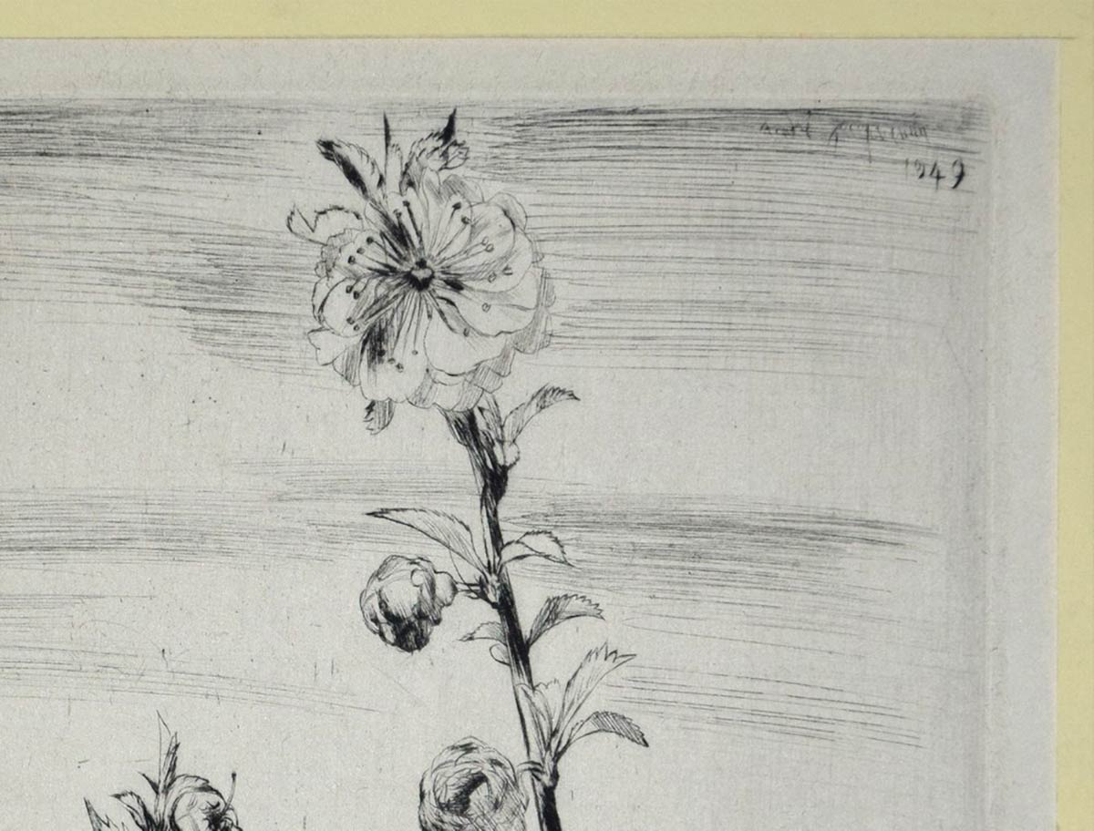 Punta secca molto fresca ed elegante che rappresenta un fiore con un paesaggio sullo sfondo. I fiori sono in primo piano e sono molto freschi, eleganti e raffinati. Il tocco del puntasecca è caratterizzato da morbidezza e morbidezza.