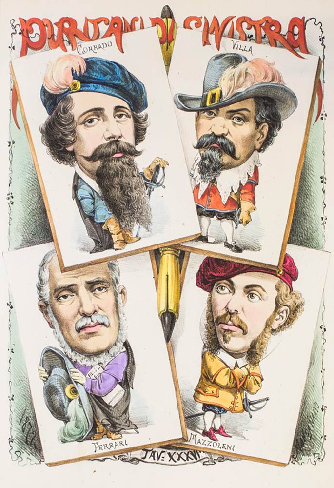 La stampa rappresenta le caricature di quattro influenti politici della fine del XIX secolo: Tommaso Villa, Antonio Corrado, Giuseppe Ferrari e Angelo Mazzoleni.
