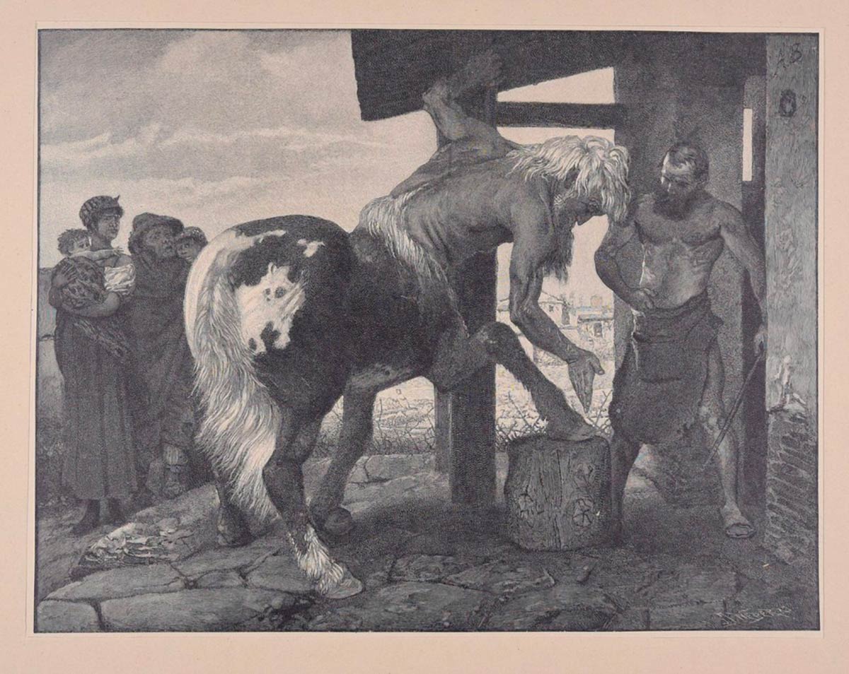 Questo xilografo in bianco e nero rappresenta un fabbro che calza uno zoccolo di un centauro. La scena è ambientata all'aperto, in una fucina; sullo sfondo, un piccolo gruppo di persone sta guardando la scena.