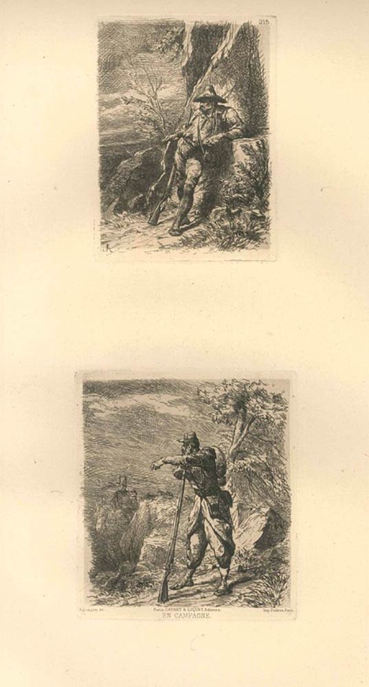 Questa stampa originale, che rappresenta due scene della vita militare, è una prova dell'artista del primo stato, come esprimono le iscrizioni sul margine inferiore della piastra: "" A. Lançon sc. / Imp. Delatre, Parigi "". Sul margine inferiore al centro è riportato il titolo e la casa editrice: "" Parigi, Cadart et Luquet, Editeurs - En Campagne "". Sul margine inferiore al centro c'è il timbro a secco della casa editrice.