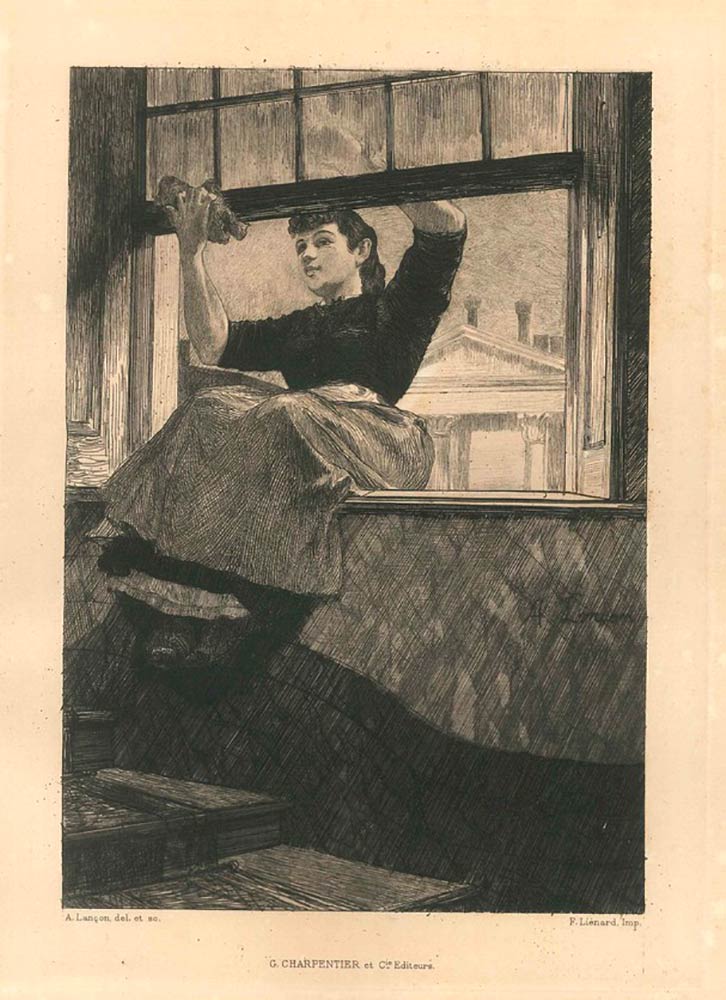 Questa stampa originale, raffigurante una donna che pulisce una finestra di vetro, è stata incisa da Auguste Lançon, stampata da F. Liénard e pubblicata da G. Charpentier e C.ie Editeurs, come indicano le iscrizioni sul margine inferiore della lastra.
