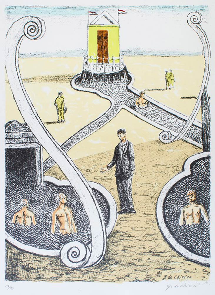"L'Ospite dei Bagnanti Misteriosi" "è una litografia originale realizzata da Giorgio de Chirico nel 1969. Firmata a mano e numerata a matita. Questa è un'edizione di 90 stampe.