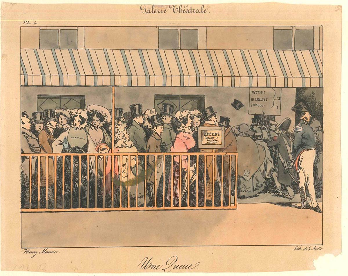 Une Queue is an amusing watercolored original lithograph realized by Henry Monnier (1805 - 1877).
