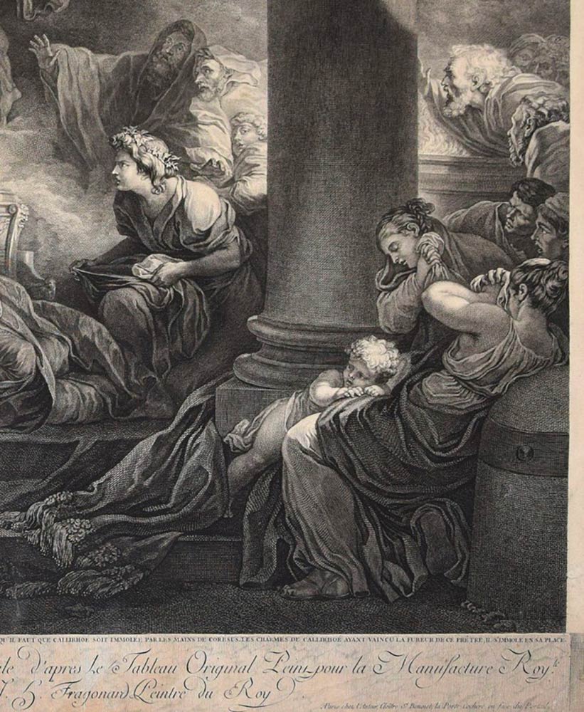 Impressione molto intensa e fresca che rappresenta l'episodio di Coresus e Calliroe come nella famosa opera d'arte di Jean-Honoré Fragonard nella seconda metà del XVIII secolo. L'impressione, realizzata in bulino, presenta, sul margine inferiore, una lunga scritta con l'intestazione.