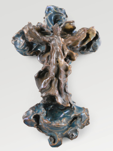 LUCIO FONTANA 1899 - 1968 CROCIFISSO signed with monogram and dated 47 on the reverse, glazed ceramic siglato L.F. e datato 47 sotto la base ceramica colorata e riflessata cm 26x15x7 Opera registrata presso la Fondazione Lucio Fontana, Milano, con il n. 1900/228 L'opera è accompagnata da certificato su fotografia rilasciato dalla Fondazione Lucio Fontana, Milano