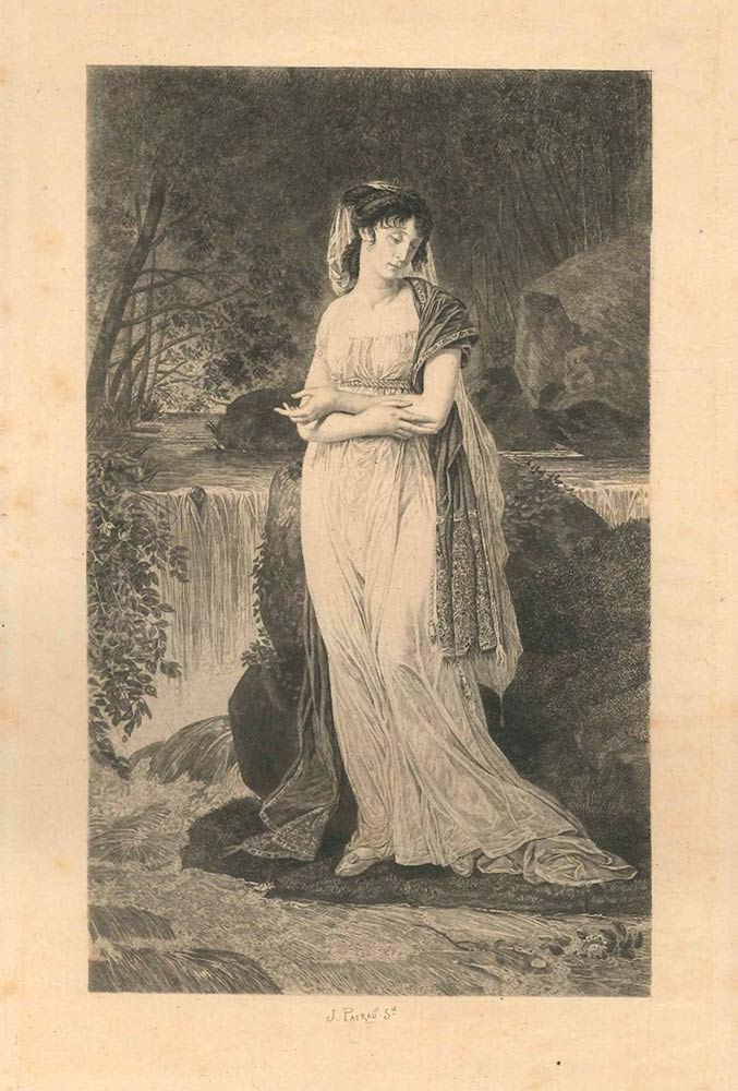 Ophelia è una bellissima incisione originale in bianco e nero su carta color avorio, realizzata da Jules Simon Payrau. Con l'iscrizione con il nome dell'autore su piastra sul margine inferiore al centro.