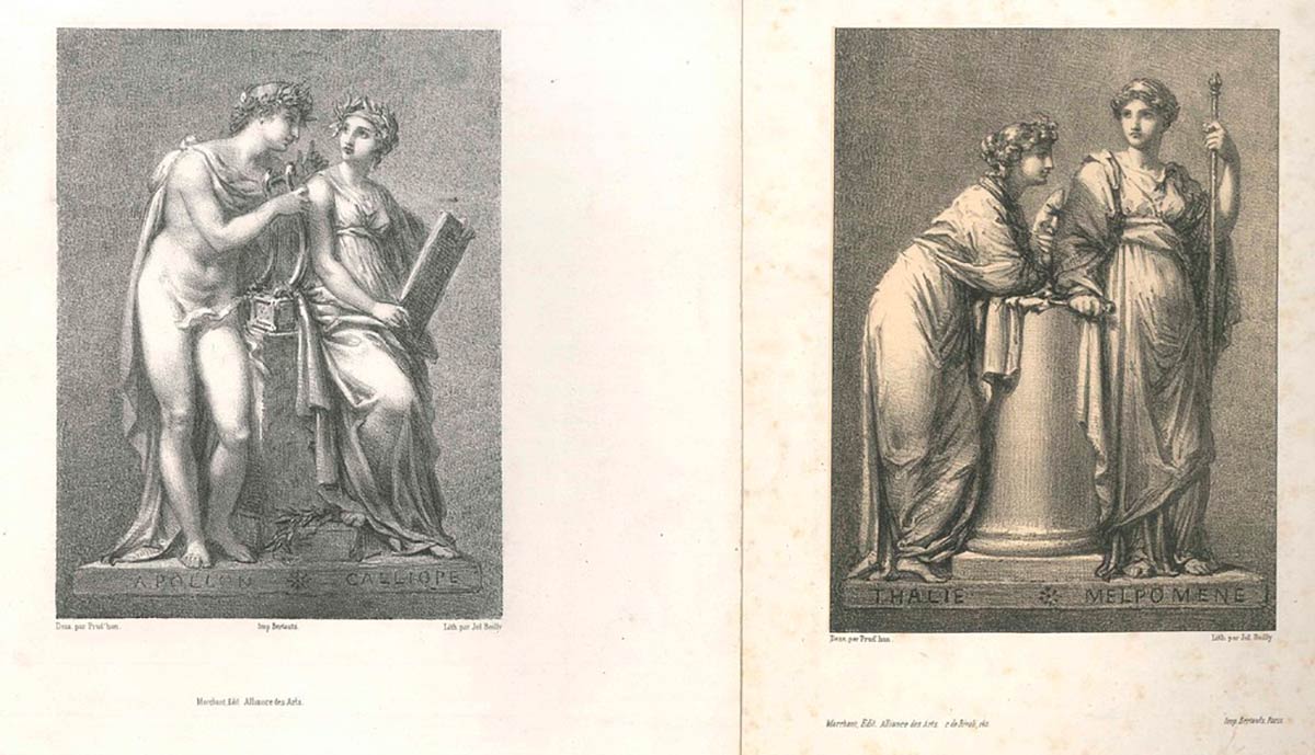Apollon et les Muses sono due meravigliose litografie realizzate nel 1851 da Julien Boilly, dopo Prud'hon, come riportano le iscrizioni dattiloscritte sotto le immagini.