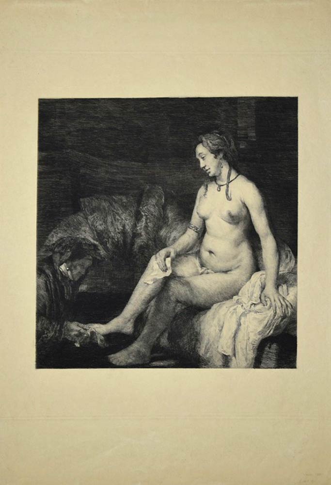 Very beautiful print realized d'aprés an original artwork by Rembrandt. The ligher figure of the woman emerges from the dark background.