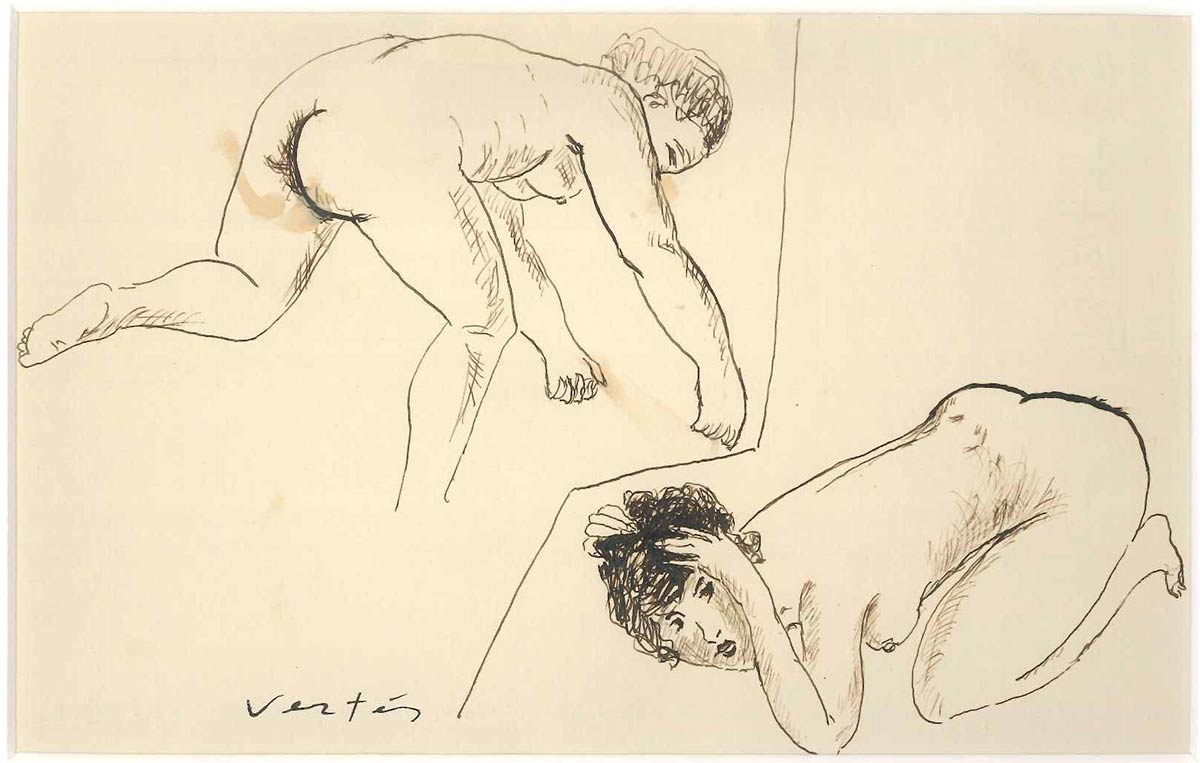 Meraviglioso disegno erotico che rappresenta due donne sensuali che strisciano nude.