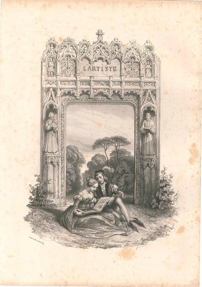 Questa stampa originale, che rappresenta una coppia che legge un libro, indipendentemente dal loro amore ardente, circondata da una natura romantica e un'architettura gotica, è stata realizzata con un tocco molto espressivo e saggio.
