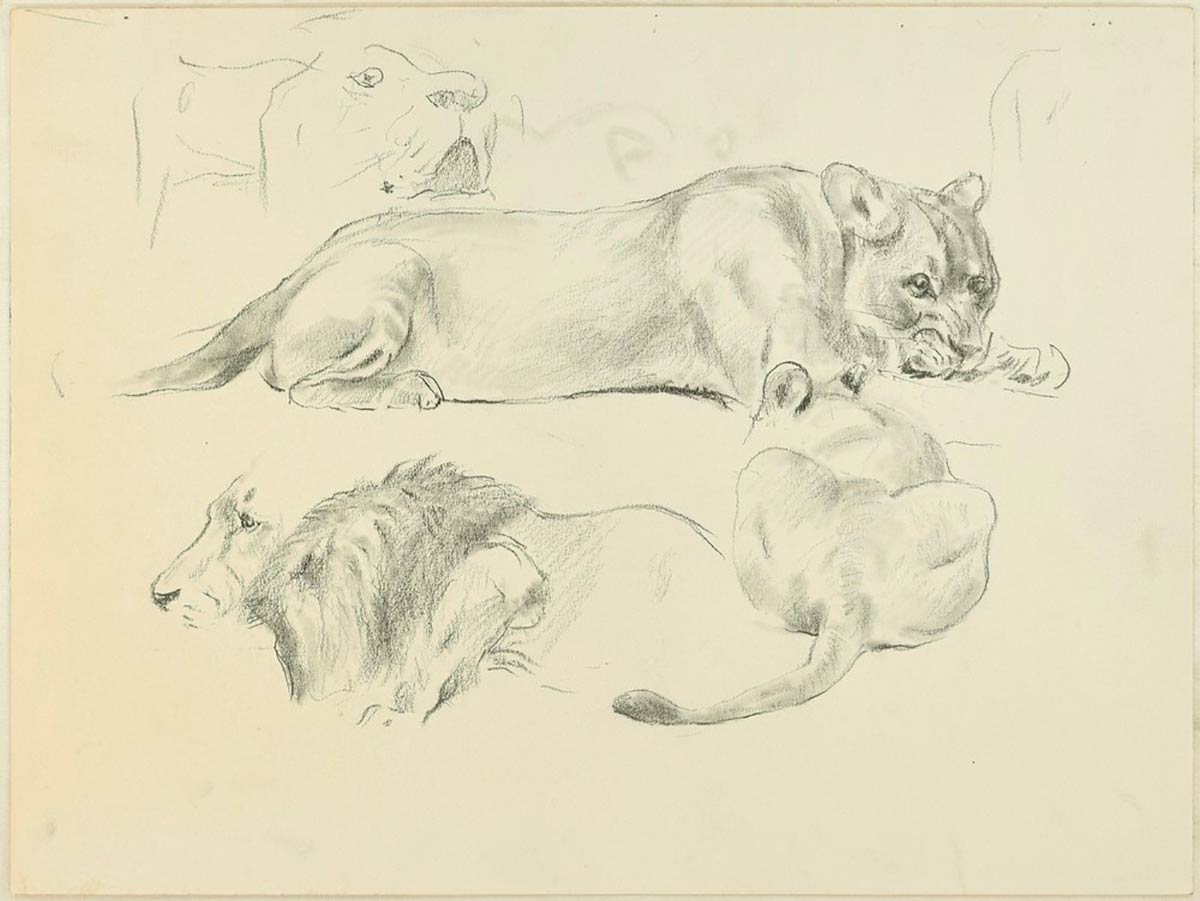 Lions è un bellissimo disegno originale a matita su carta color avorio realizzato nel XX secolo dall'artista tedesco Wilhelm Lorenz, noto anche come Willi Lorenz. Alcuni interventi sono stati fatti con un frullatore.