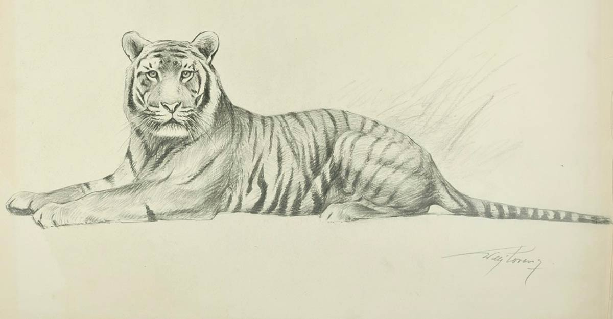 Tiger è un bellissimo disegno originale a matita su carta color avorio, vergella e filigrana Rives Canson, realizzato nel XX secolo dall'artista tedesco Wilhelm Lorenz, noto anche come Willi Lorenz. Firmato a matita sul margine inferiore destro.
