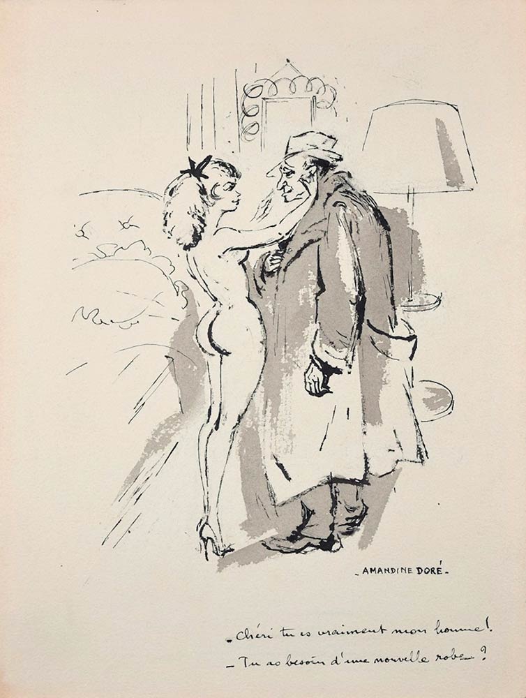 Chéri tu es vraiment mon homme! È un divertente inchiostro e acquarello cinese su carta Johannot con filigrana realizzato dal pittore, illustratore e scrittore francese Amandine Doré nella seconda metà del XX secolo.