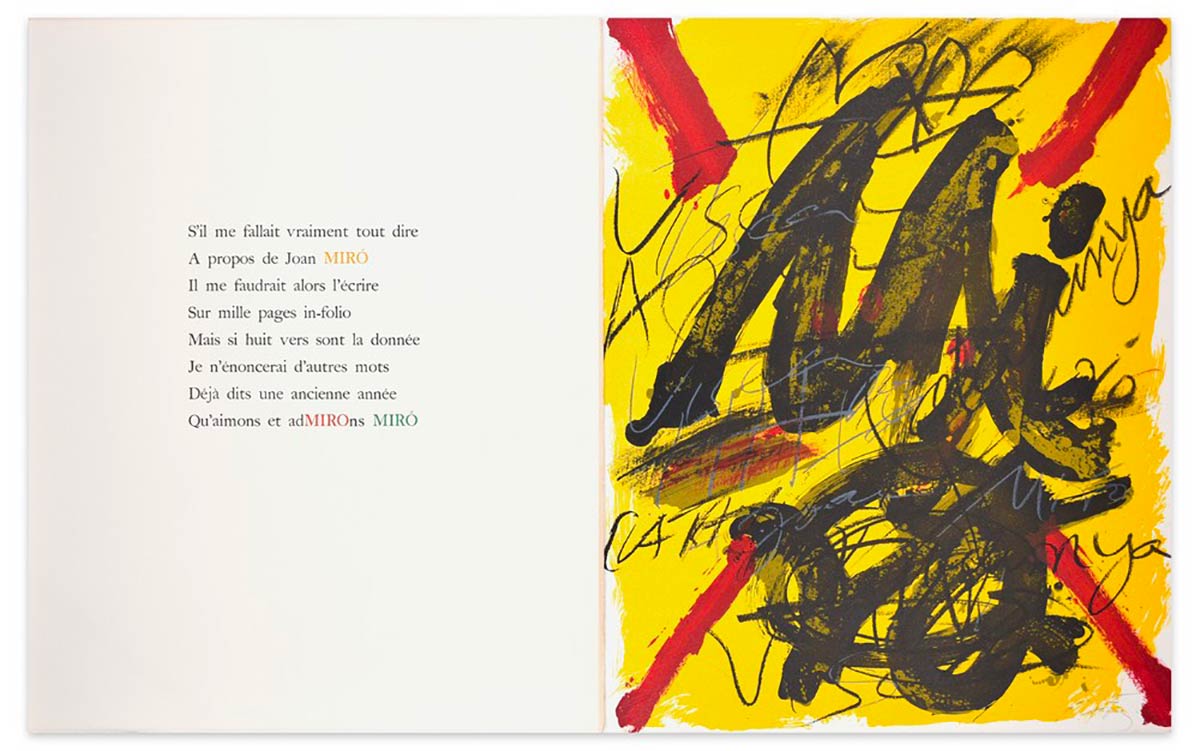 L'opera d'arte è composta da una copertina con titolo e autore; all'interno di un testo francese e una dedica scritta a mano a penna e datata Parigi 1973: "" Mirò = Catalunja = Libertat ¡Visca Joan Mirò!