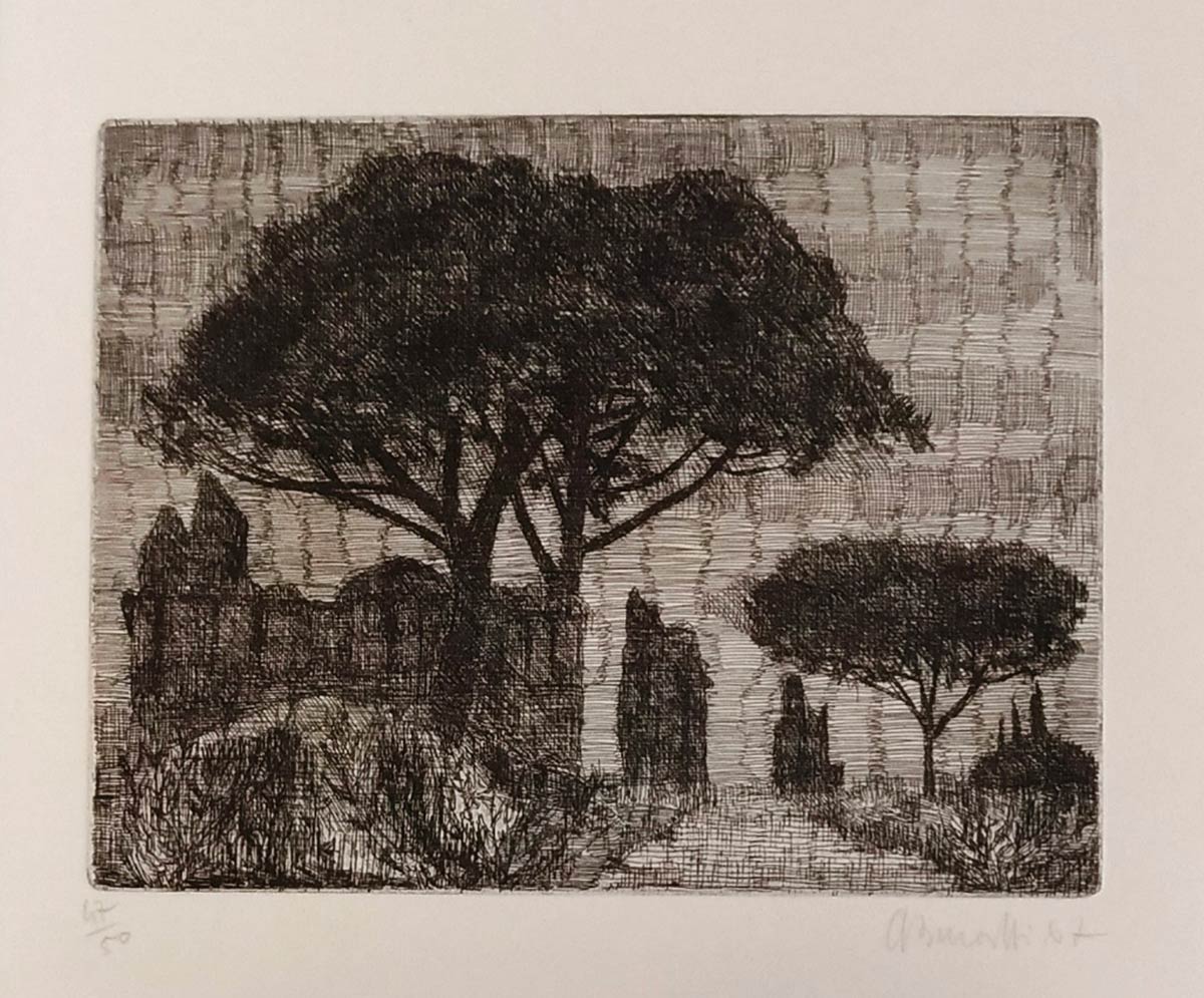Roma, Parc of Aqueducts" "è una bella incisione in b / n realizzata da Armando Buratti nel 1967 che rappresenta un tipico paesaggio romano. Al centro della scena un monumentale olmo e una strada di campagna verso l'orizzonte.