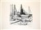 Marvelous artwork representing a harbor with some boats; in the center of the composition there are small boats with rolled ropes. In the background, there are high sailings realized with black strokes.