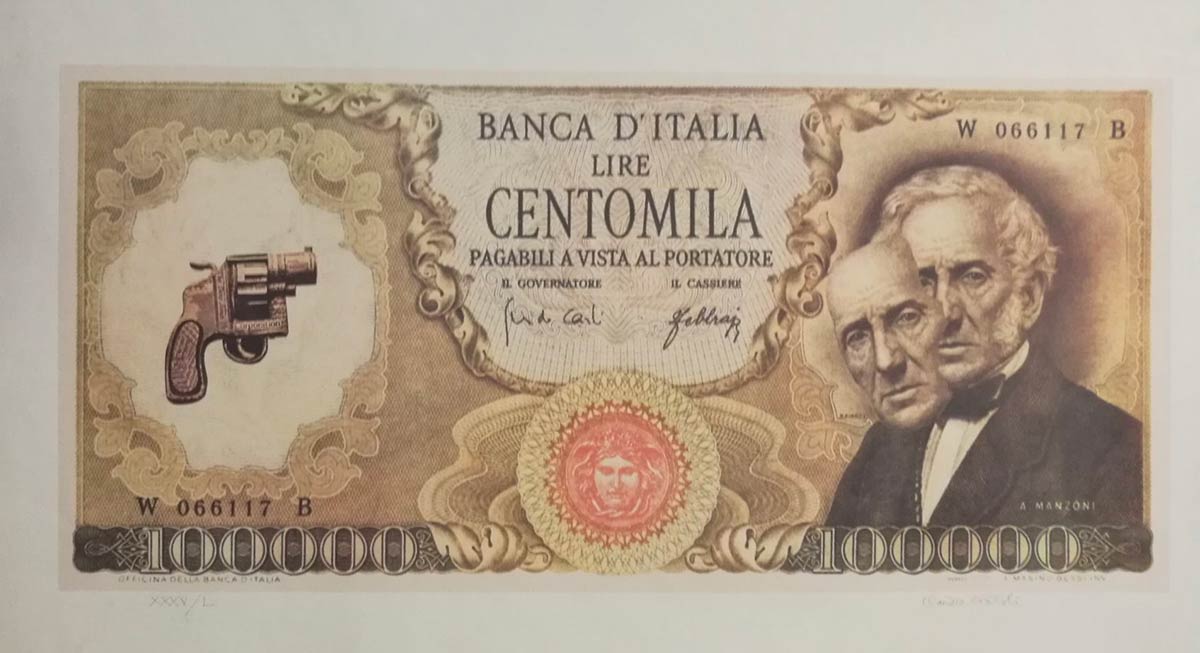 This artwork represents the Italian banknote of one-hundred thousand liras. On the right, there is a portrait of the great Italian writer Alessandro Manzoni with a double face (on the original one-hundred thousand liras there used to be the portrait of Manzoni with an empty space on the left). On the left, there is a pistol aiming towards the portrait of Manzoni. Manzoni is an Italian classical symbol and icon. Together with Dante, Manzoni is considered one of the most important writers in Italy and an innovator of the Italian language. This banknote was issued in Italy from 1967 to 1979, and was designed by the Italian engraver Trento Cionini.