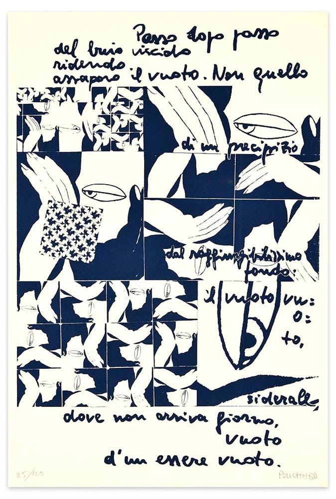 Questa è una stampa originale con scritte e immagini in bianco e nero che dimostrano una doppia sensibilità: abilità figurative e tecniche e abilità poetiche. È incredibile leggere parole sul magico mondo del sesso e dell'amore, accompagnate da composizioni a mosaico di articolazioni.