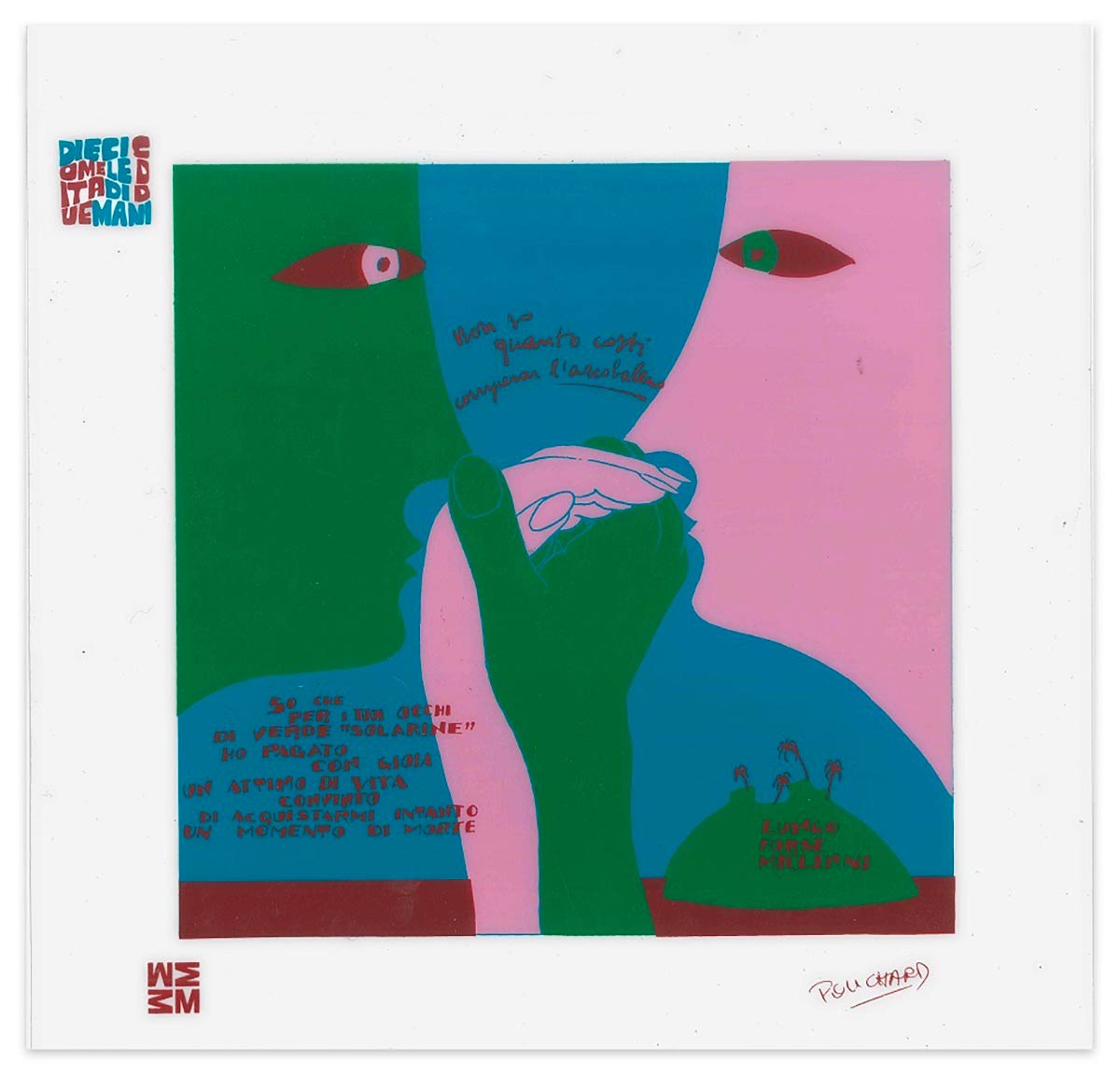 Dal portfolio "" Diecicomeleditadiduemani "", contenente 10 stampe serigrafiche su acetati, con poesie e disegni di Ennio Pouchard. Stampato nel laboratorio Etrusculudens di Roma, per la Galleria Marino, Roma.