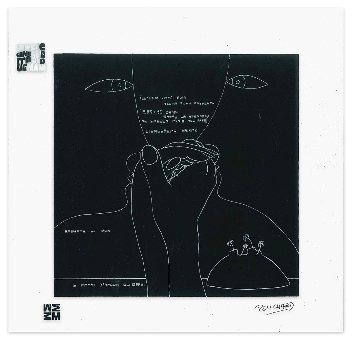 From the porfolio "Diecicomeleditadiduemani", containing 10 silk-screen prints on acetates, with poems and drawings by Ennio Pouchard. Printed in the Etrusculudens laboratory in Rome, for the Marino Gallery, Rome.