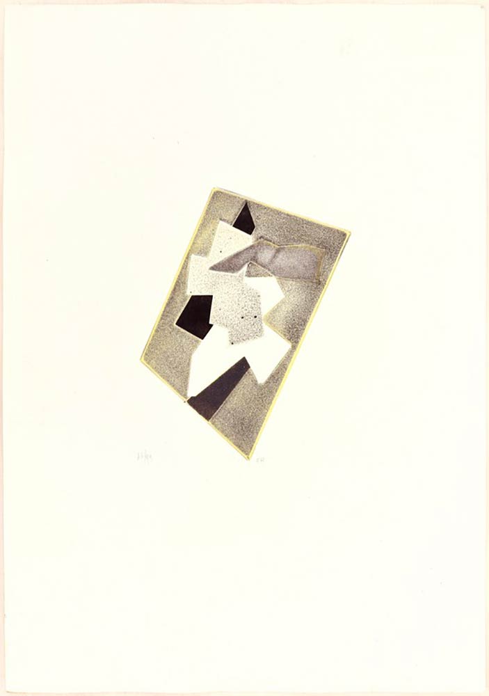 "La composizione astratta è un'incisione colorata e una calcografia su carta, realizzate negli anni '70 dall'artista tedesco Hans Richter, pubblicato da La Nuova Foglio, una casa editrice di Macerata.