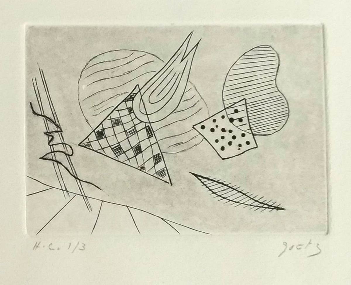 È un'incisione realizzata da Goetz che rappresenta una composizione astratta; al centro del piatto ci sono alcune forme geometriche con motivi diversi: linee orizzontali, motivo a scacchi e pois. Goetz realizzò diverse incisioni e opere grafiche in generale. Insieme a sua moglie, nel 1960, ha inventato una nuova tecnica grafica: il Carborundum Mezzotint. La sua produzione grafica è stata molto interessante e il suo lavoro è rappresentato in oltre 100 gallerie nel mondo.