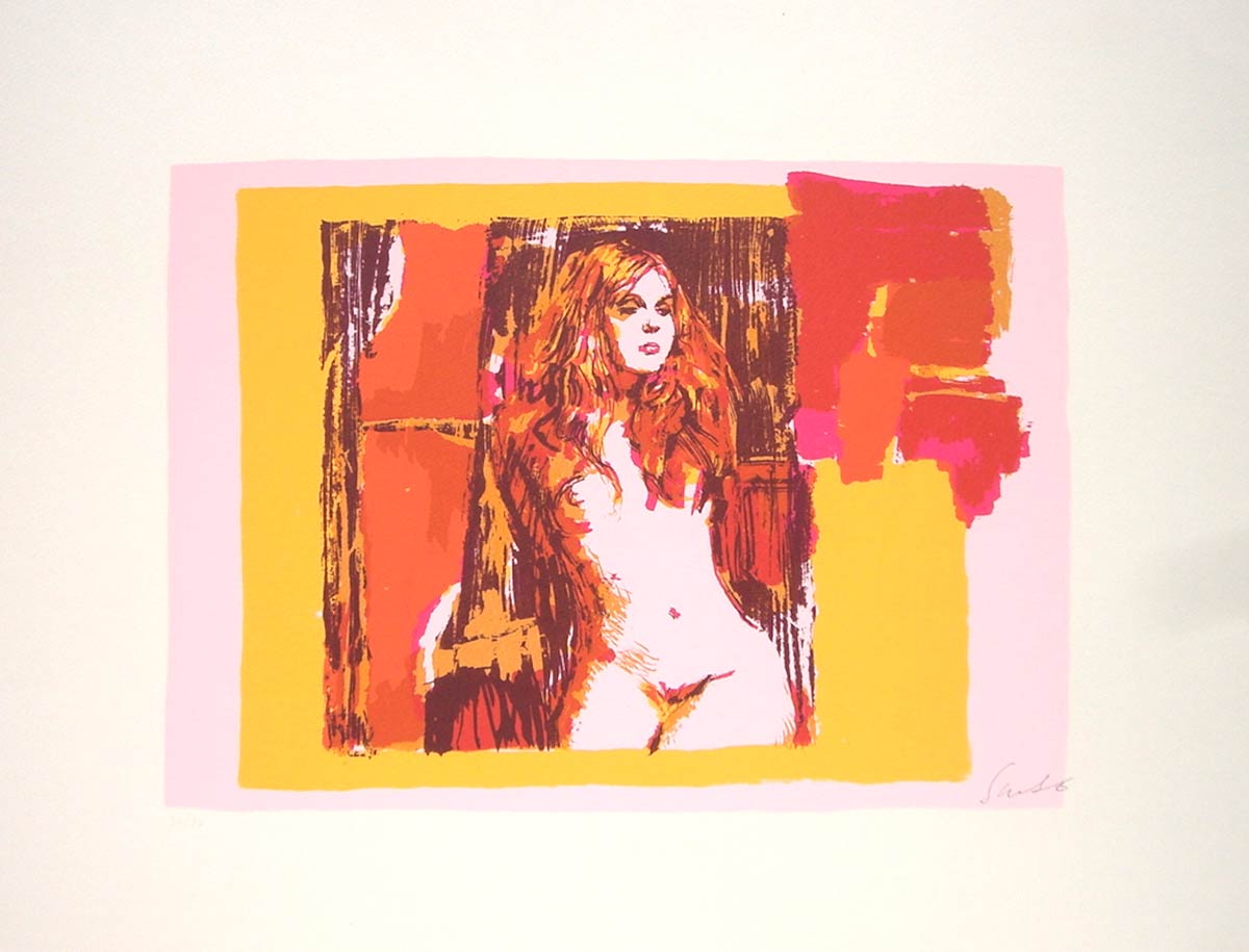 Bellissima serigrafia raffigurante un nudo femminile con uno sfondo caratterizzato da forme geometriche colorate. Come molte opere di Simbari, c'è una predominanza di sfumature rosa e arancioni.