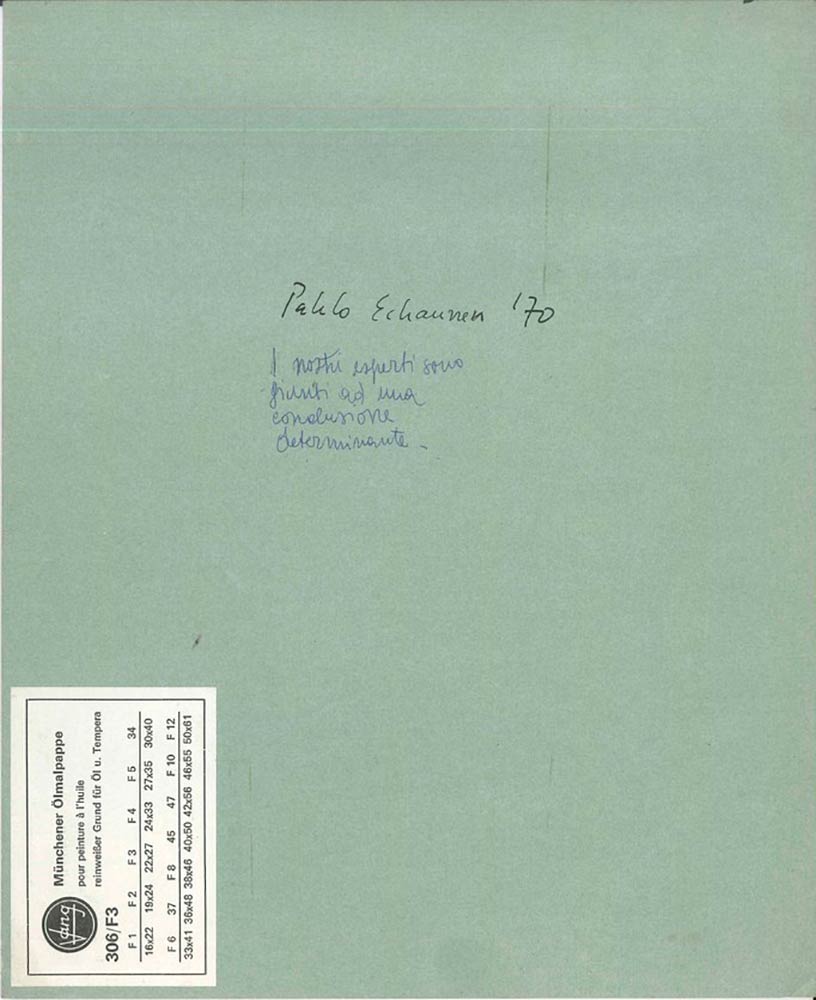 Firmato e datato con inchiostro nero sul margine inferiore destro. Sul retro, titolo, anno di creazione e firma sono scritti a mano con inchiostro blu e nero.
