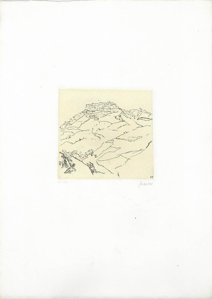 Questa stampa originale rappresenta un paesaggio naturale con una piccola e tranquilla città in lontananza (forse è Urbino) con un linguaggio sobrio e un segno delicato.