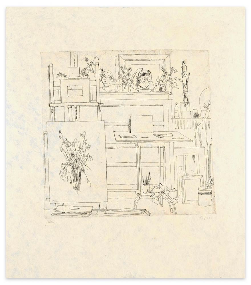 Questa stampa originale è interessante perché rappresenta l'atelier dell'artista, una stanza ordinata con tutti gli strumenti del mestiere: cavalletti, pennellate, maschere, tele. Questa opera d'arte ci consente di partecipare alla vita quotidiana dell'artista.