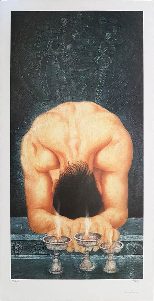 Raffigura una figura maschile inginocchiata con tre candele. Lo sfondo presenta decorazioni orientali geometriche. L'opera di Satish Gupta è piena di misticismo, decorazioni orientali e figure dell'antica cultura e tradizione indiana. I colori sono vivaci e sfumati e c'è una grande luminosità.