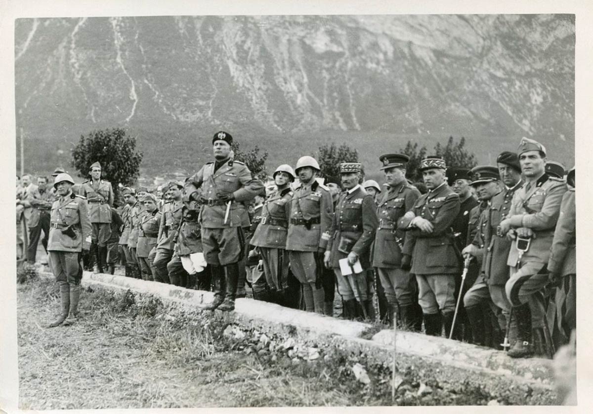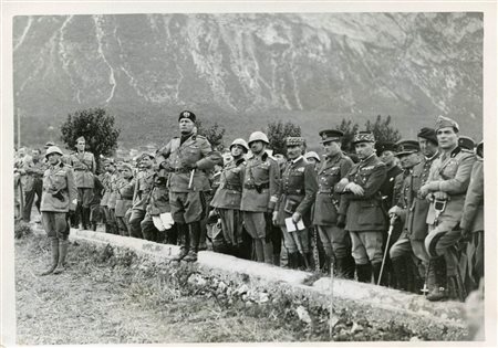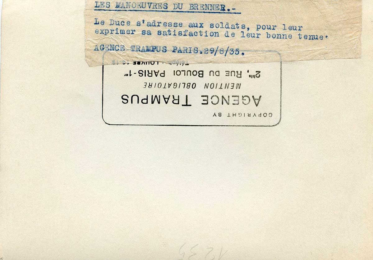 Mussolini parla alle truppe 29/8/1935. Celloidina, timbro e clichè agenzia Trampus, Paris