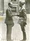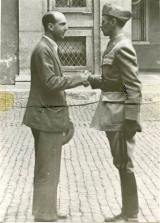 Il comandante dei corazzieri Sforza saluta Umberto II di Savoia in partenza per l'esilio, 1946. Stampa su carta politenata probabilmente non coeva, indicazioni a penna al retro.