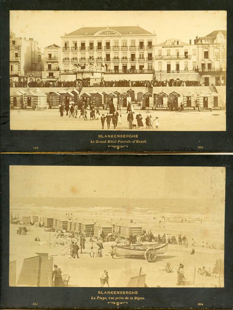 Lotto di due viste del lungomare di Blankemberghe, 1890 circa. Stampe all'albumina su cartonato nero con bordi e intestazione oro. Nel lotto una vista veso il lungomare e una vista verso la spiaggia. Interessantissimi elementi architettonici e strutture mobili balneari.