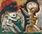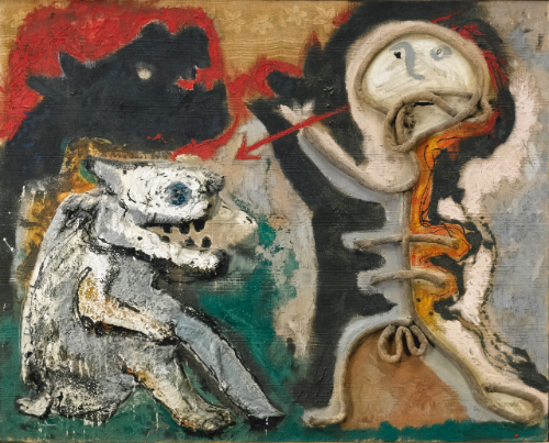 ENRICO BAJ 1924-2003 UOMO CONTRO DUE ANIMALI signed, titled and dated 55 on...
