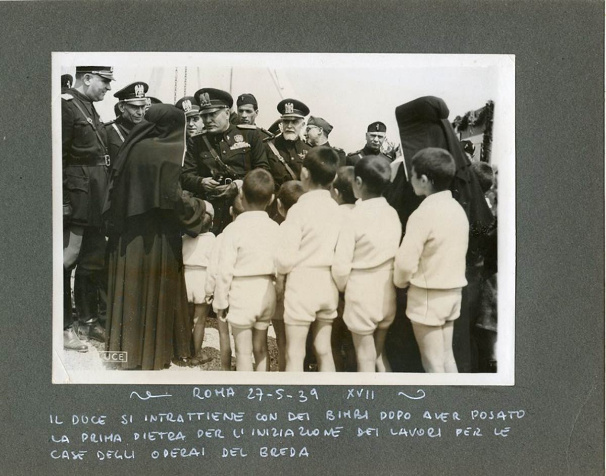 Lotto di due stampe Istituto Luce: Mussolini a Ivrea e Mussolini inaugura l'inizio lavori del Villaggio Breda a Roma, 1939. Aristotipi con loco Istituto Luce applicati a cartonato leggero con note scritte a mano.Dimensioni stampe 18 x 13 cm, cartonato 24 x 19 cm