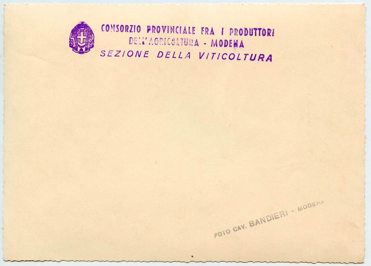 Ritratto di gruppo con personaggi fascisti, 1935 circa. Stampa su carta baritata frastagliata a ghigliottina e realizzata da Cav. Bandieri Modena. Al retro timbro Consorzio Viticoltori di Modena.