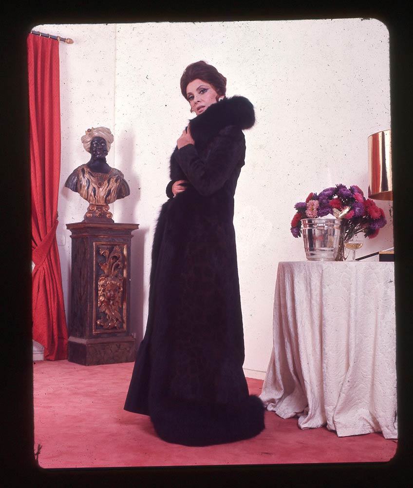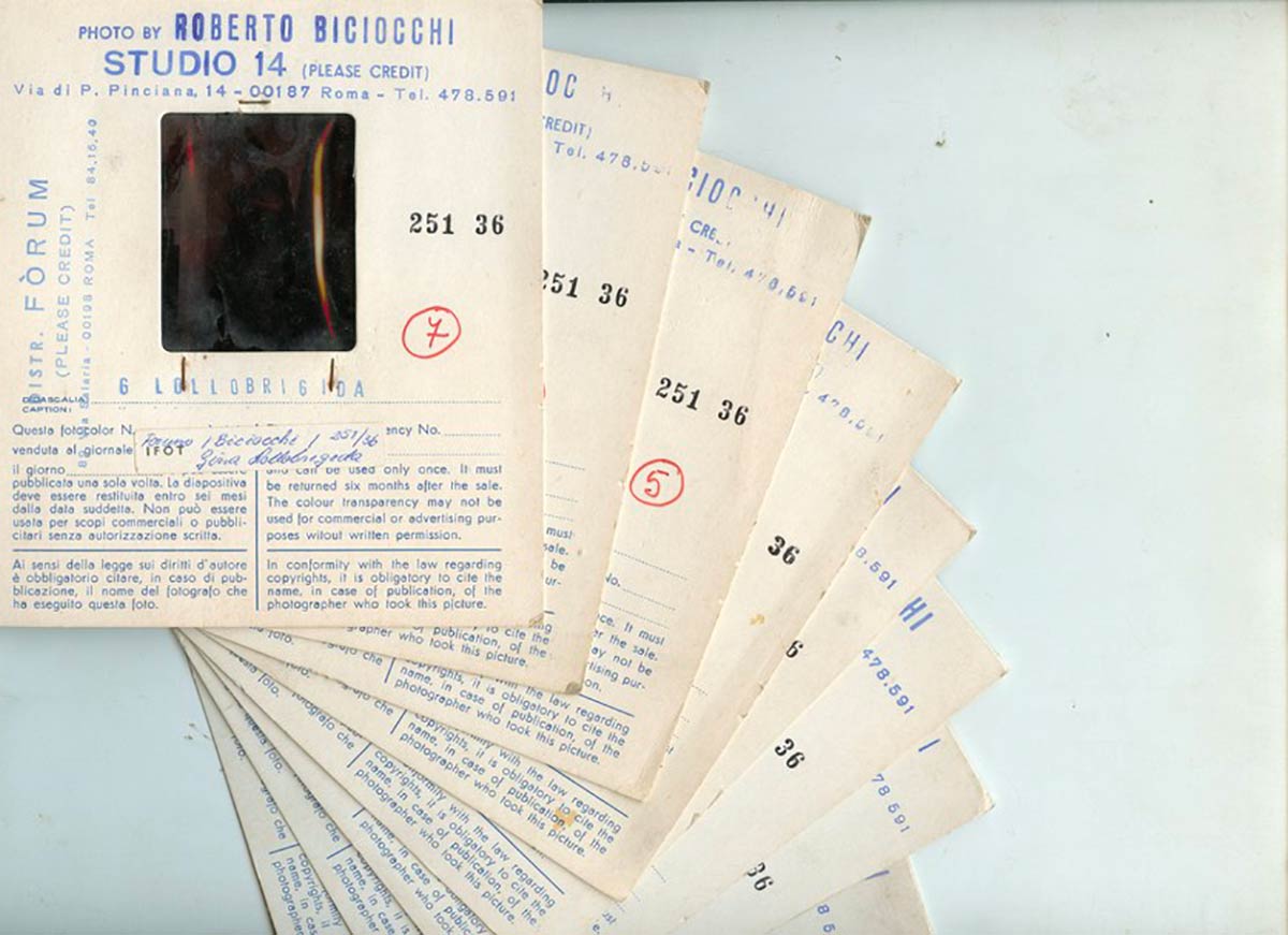 Gina Lollobrigida, lotto di dieci diapositive a colori in medio formato realizzate da Roberto Biciocchi per “Studio 14”. Astuccio originale con indicazioni d'agenzia. Nelle foto Gina Lollobrigida indossa una collezione di pellicce. Le diapositive non sono state ispezionate per non danneggiare la confezione, alcune presentano lievi incollaggi con la pellicola protettiva ma il fotogramma risulta molto buono. Scatti originali d'autore, non riproducibili. Da queste diapositive è possibile realizzare stampe di altissima definizione.