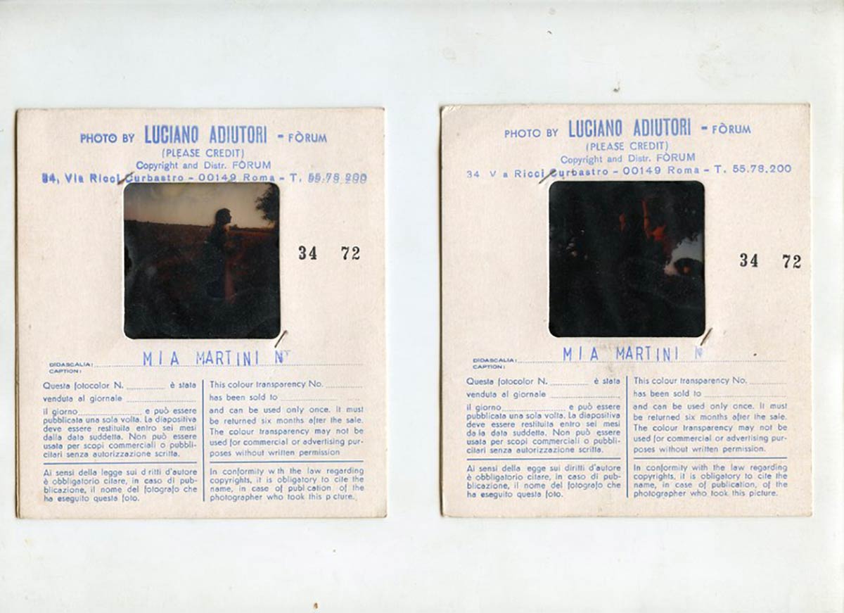 Mia Martini, lotto di due ritratti in diapositiva medio formato a colori realizzati da Luciano Adiutori, 1972. I fotogrammi sono contenuti nell'astuccio d'agenzia (non ispezionato), presentano lievi tracce di umidità e di polvere rimovibile. Fotografie uniche, da cui posso essere realizzate immagini di altissima qualità.