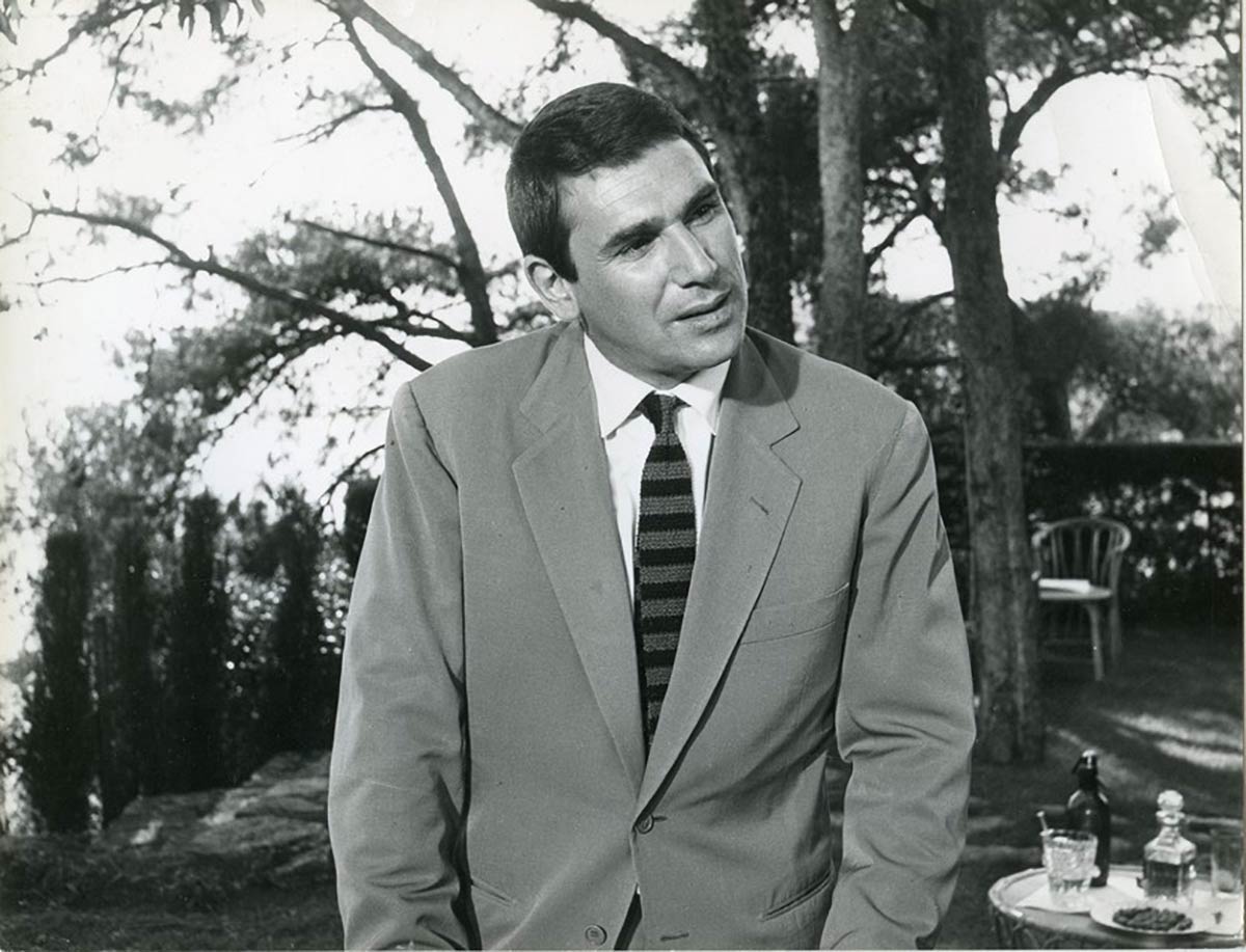 Walter Chiari su set non identificato, 1965 circa. Stampa su carta monopolitenata. Ottime condizioni, lievi pieghe sui margini.