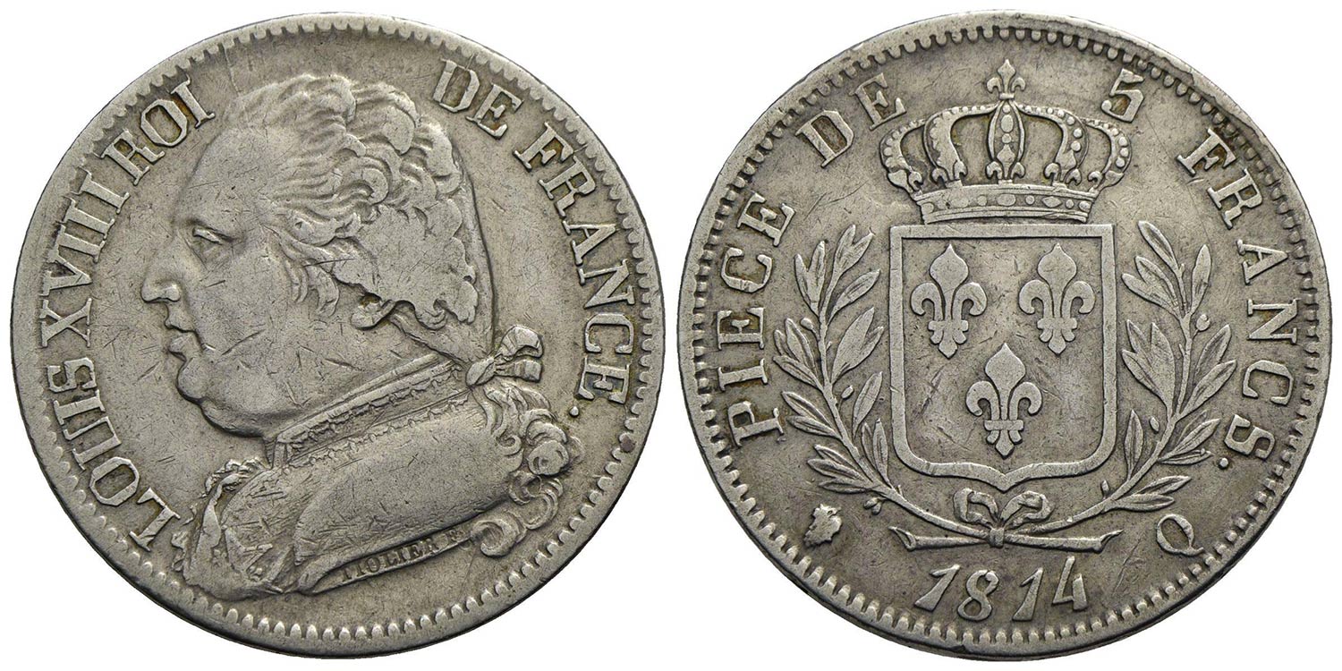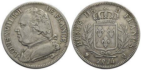 FRANCIA - Luigi XVIII (1814-1824) - 5 Franchi - 1814 Q - AG R Kr. 702.1<br>BB+