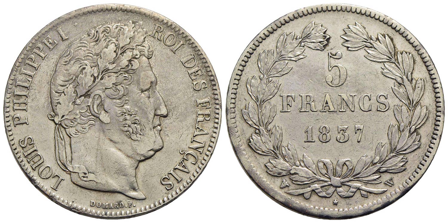 FRANCIA - Luigi Filippo I (1830-1848) - 5 Franchi - 1837 W - AG Kr. 749.13 Segnetti<br>BB+/qSPL