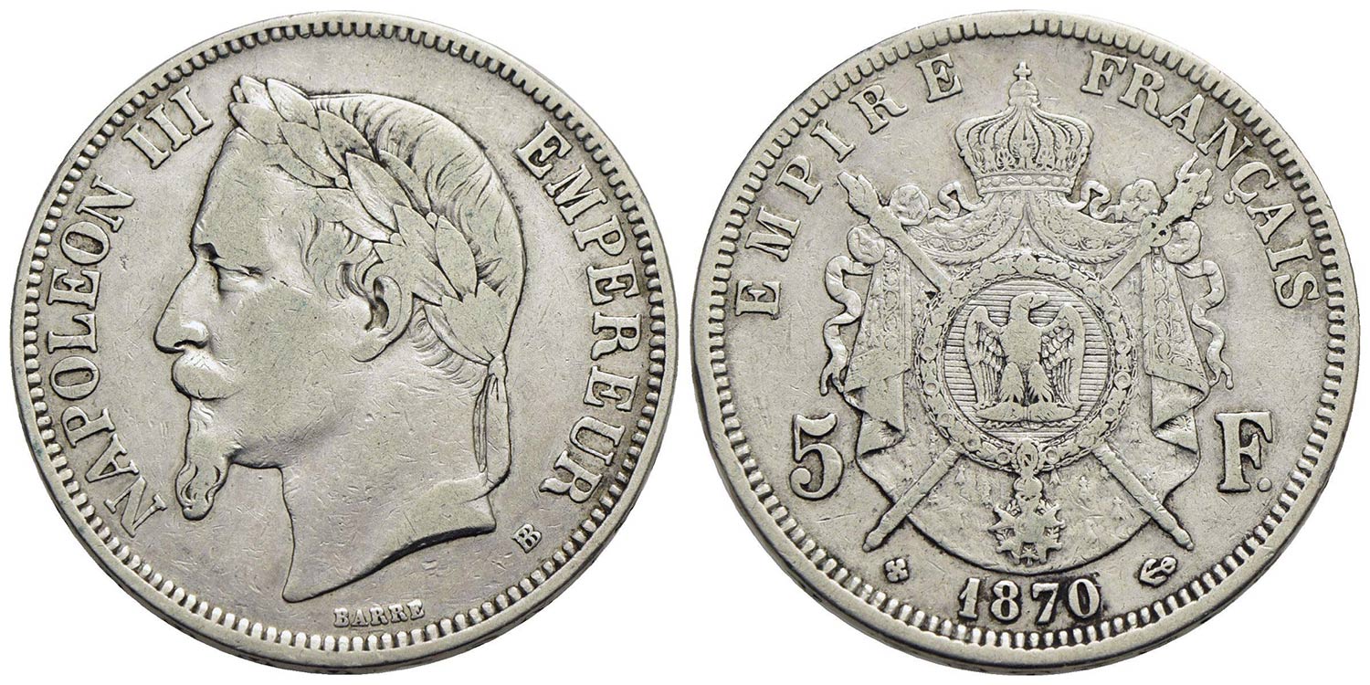 Lotto 114 | FRANCIA - Napoleone III (1852-1870) - 5 Franchi - 1870 BB - Testa laureata - AG Kr. 799.2<br>BB