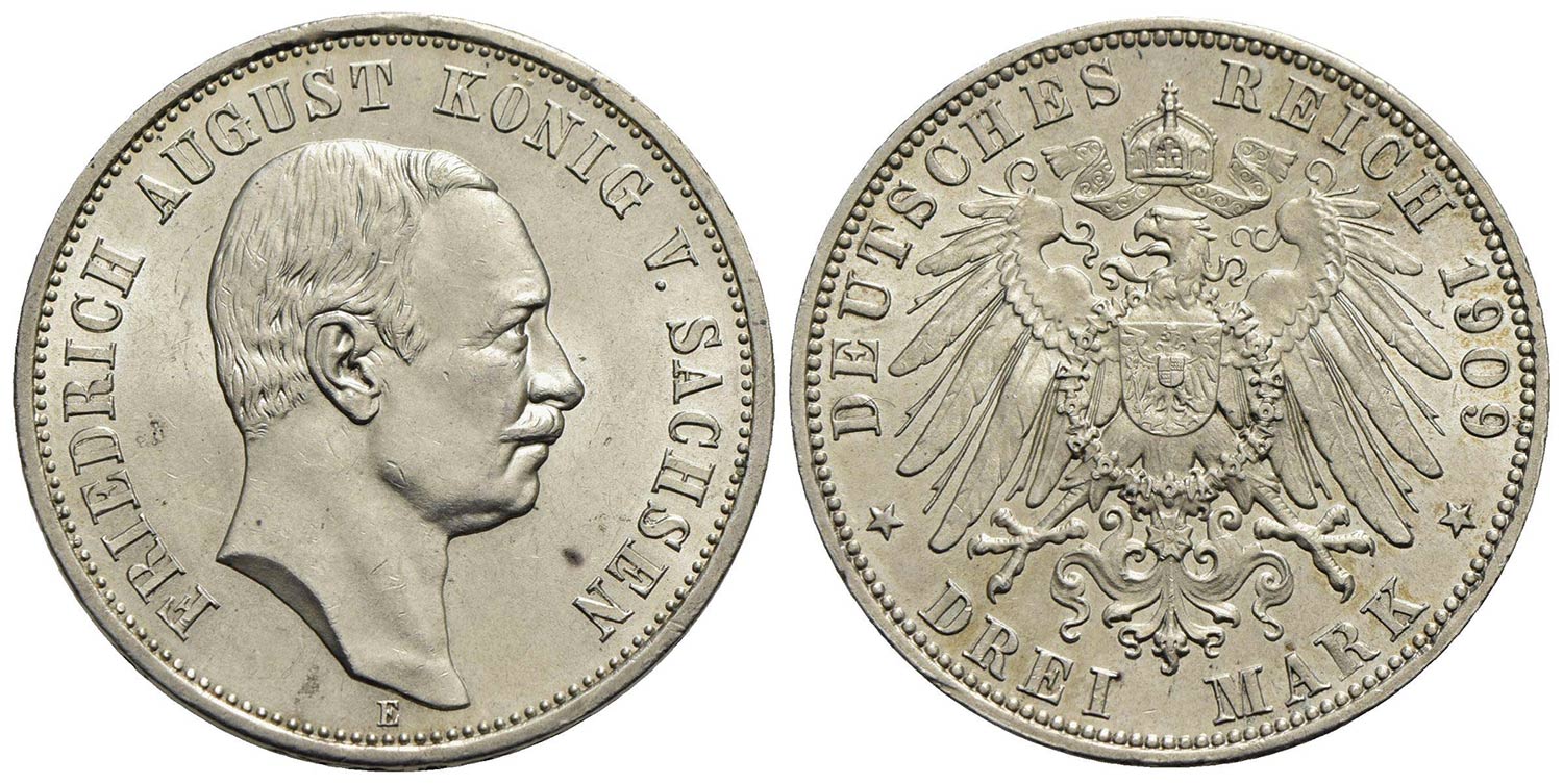 GERMANIA - SASSONIA - Federico Augusto III (1904-1918) - 3 Marchi - 1909 E - AG Kr. 1267<br>FDC
