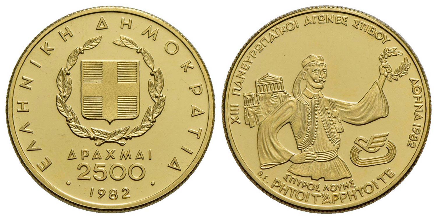 Lotto 177 | GRECIA - Repubblica (1974) - 2.500 Dracme - 1982 - Atleta con corona - AU Kr. 141 Proof<br>FDC