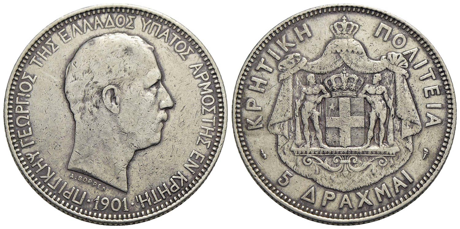 GRECIA - CRETA - Giorgio Principe (1898-1906) - 5 Dracme - 1901 - AG R Kr. 9<br>BB