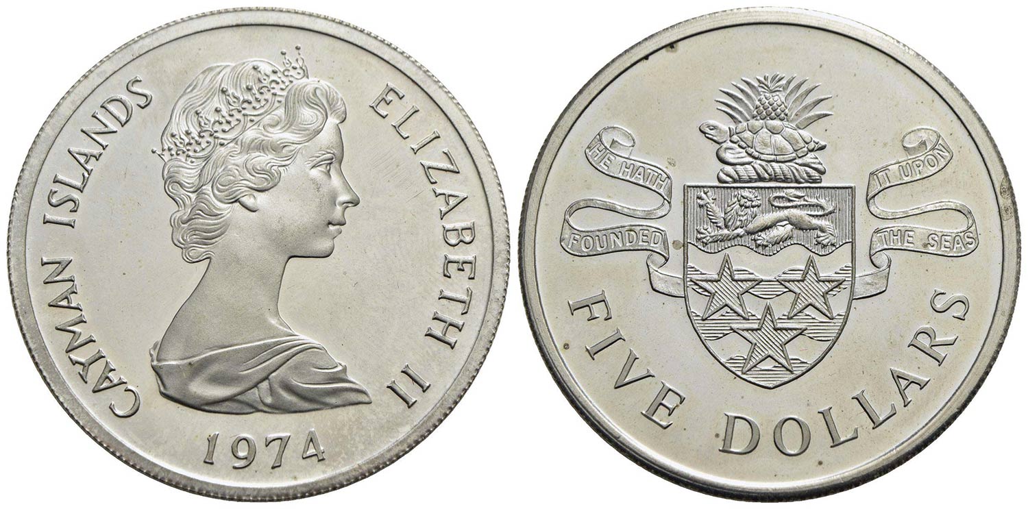 ISOLE CAYMAN - Elisabetta II (1952) - 5 Dollari - 1974 - AG Kr. 8 Proof