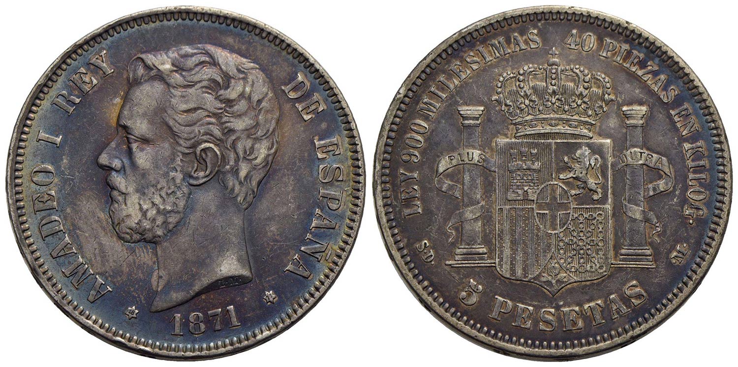 SPAGNA - Amedeo I (1871-1873) - 5 Pesetas - 1871 (71) SD M - AG Kr. 61 Patinata<br>qSPL/SPL+