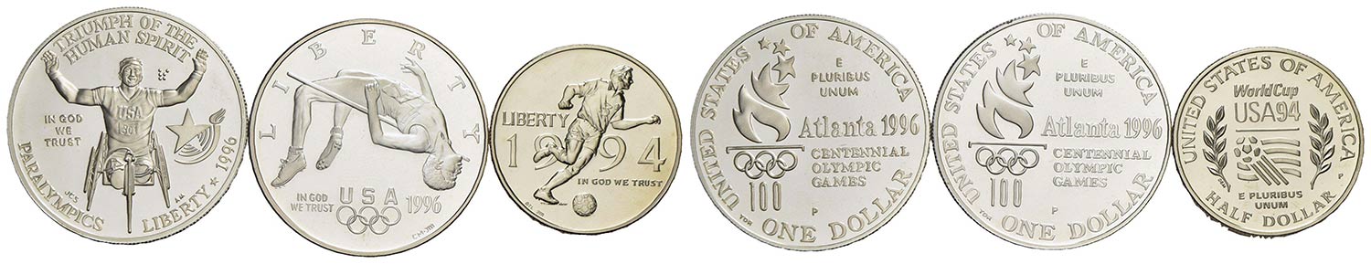 U.S.A. - Dollaro - 1996 P - Paraolimpiadi - AG Proof in capsula assieme a Dollaro 1996 P Salto in alto e 1/2 dollaro 1994 P Mondiali di calcio - Lotto di tre monete