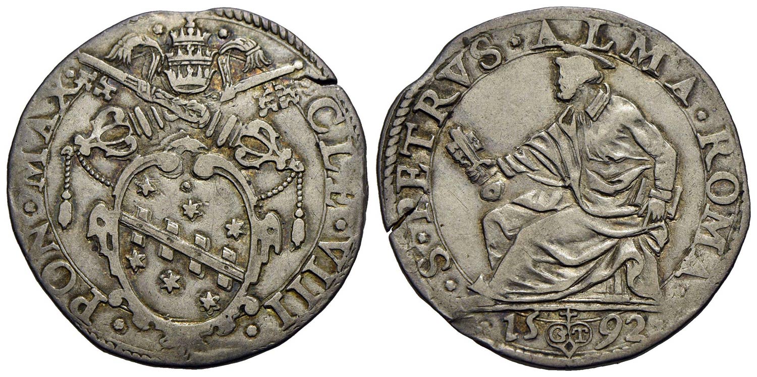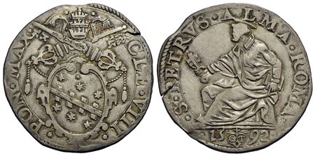 ROMA - Clemente VIII (1592-1605) - Testone - 1592 - Stemma ovale in cornice - R/ Il Santo seduto a s. - (AG g. 9,5) R CNI 13; Munt. 32